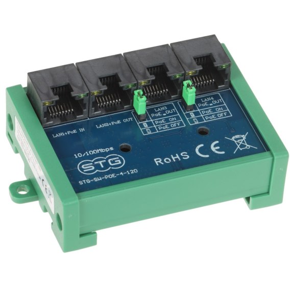 STG-SW-POE-4-120 został zaprojektowany jako przedłużacz sieci LAN (extender) i zasilacz PoE. Przeznaczony jest do współpracy z kamerami IP i innymi urządzeniami sieciowymi zasilanymi przez PoE 802.3at/af i PoE PASSIVE. Regeneruje sygnał sieciowy i przekazuje zasilanie PoE do wybranych wyjść, a kompaktowe rozmiary dają więcej możliwości instalacji - można go zamontować do standardowej szyny DIN.