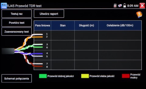 | Reflektometr TDR: | Wykrywanie i lokalizacja miejsca przerwania kabla (tylko UTP) |